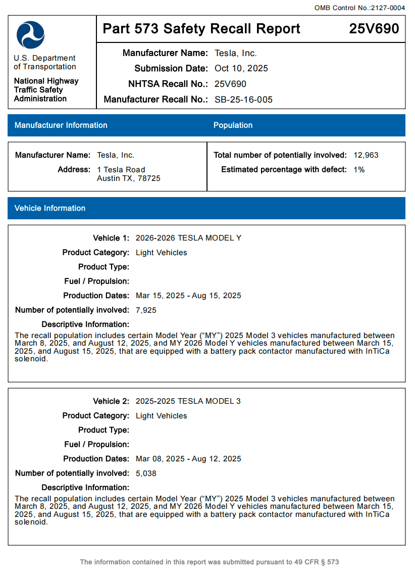 Tesla Recalls Nearly 13,000 Model Y and Model 3 Vehicles Over Power Loss Risk